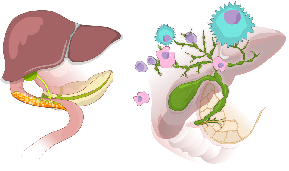 Bile is a yellow-green fluid produced by your liver to aid digestion. When bile ducts are damaged by inflammation and scarring (cholangitis), bile and other substances collect in the liver, which in turn damages liver cells.
